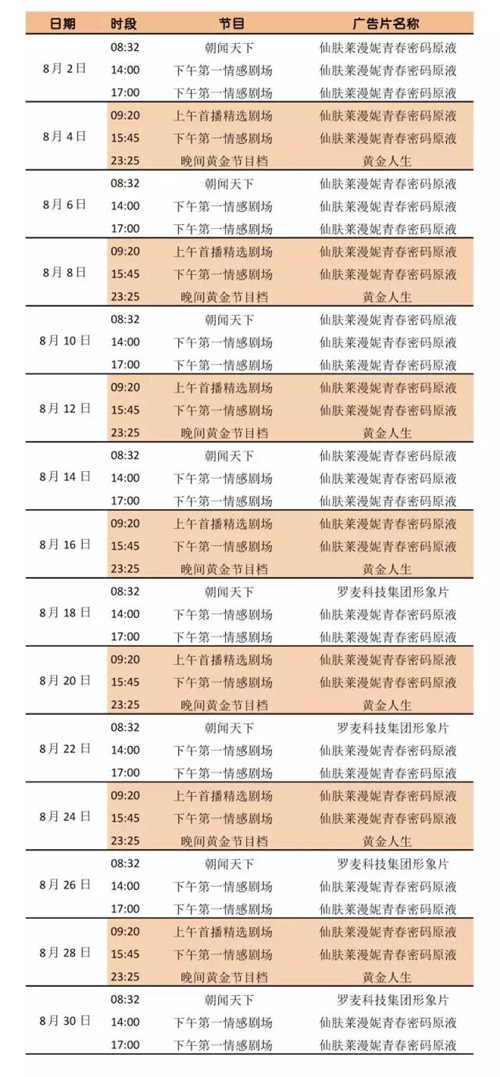 本次央视广告共涵盖三个内容:罗麦科技集团企业形象片、罗麦科技仙肤莱漫妮青春密码原液新品广告片、罗麦科技黄金人生广告片,分别在以下时间段播出: