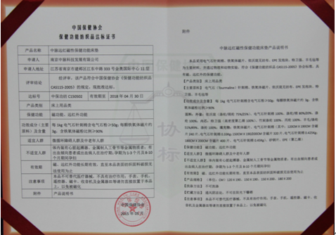 保健功能纺织品达标证书由中国保健协会颁发,作为目前中国健康行业的权威机构,中国保健协会联合多家国家级专业机构对中脉床垫分别进行抗菌功能、磁功能、远红外功能等方面的检测,以此确保保健功能床垫的各项指标都符合相关技术标准。