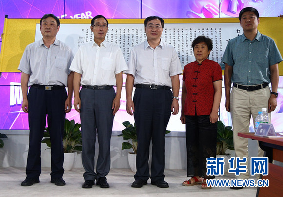 (从左至右)中国香料香精化妆品工业协会理事长陈少军、国家食药总局新闻宣传司副司长申敬旺、新华网常务副总裁魏紫川、中国美发美容协会会长闫秀珍、全国工商联美容化妆品业商会秘书长许景权