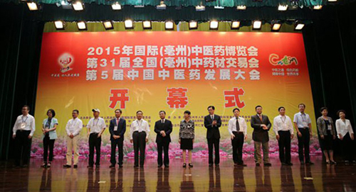 9月9日上午,2015年国际(亳州)中医药博览会、第31届全国(亳州)中药材交易会暨第5届中国中医药发展大会隆重开幕。康美药业作为承办单位之一积极组织、参与各项活动。原卫生部副部长、国家中医药管理局原局长、世界中医药学会联合会主席佘靖宣布大会开幕;亳州市委书记杨敬农,国家中医药管理局副局长马建中,中国贸促会中国国际商会会员部部长刘振华,中国工程院院士、中国中医科学院院长、天津中医药大学校长张伯礼,安徽省中医药管理局局长董明培,中国中药协会秘书长王桂华,国医大师金世元、刘敏如、徐经世、唐祖宣,以及来自全国28所知名医药高校科研院所、300多家中医院的负责人、康美药业副总经理韩中伟等600多名知名企业家代表、相关政府单位负责人出席开幕式。亳州市委副书记、市长汪一光主持开幕式。