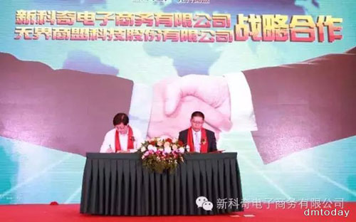 远东集团执行总裁、领航集团董事长刘阳与广东无界商盟科技股份有限公司董事长裴蕾,现场签约,达成战略合作共识,共创千亿的新科奇品。