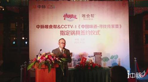 中脉中国区总裁李达兵代表中脉致辞。李总表示:“此次唯食帮签约央视《中国味道•寻找传家菜》并成为指定锅具,是唯食帮在成为2015年意大利米兰世博会中国馆指定厨具产品之后,再一次闪耀在万众瞩目的品牌舞台。古色古香的四合院内,古典与现代的融合,饕餮美食和精品锅具的相得益彰,必将酿造出中国的“好味道”。