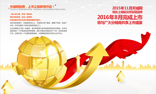 2015年5月,国务院公布了《关于大力发展电子商务加快培育经济新动力的意见》明确指出,要加大金融服务支持;建立健全适应电子商务发展的多元化、多渠道投融资机制,鼓励符合条件的互联网企业境内上市。随后,又发文敲定了“互联网+”11项重点行动。置身于“大众创业、万众创新”时代大潮和“互联网+”新风口下的天城网,顺势而发,抢占先机,紧密配合湖南““一带一部”战略定位,抓住一系列国家战略机遇,2015年11月左右将在上海股交所实现挂牌,2016年8月左右完成上市,与广大分销商共享上市盛宴,实现更高层次、更大力度的双赢。我们有理由相信,未来,天城网必将绘制出一幕幕波澜壮阔的碧海蓝天,开启“互联网+创新创业”历史新篇章!
