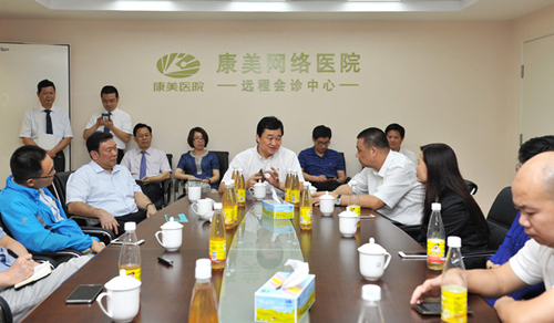 随后,田舒斌董事长一行来到康美网络医院远程会诊中心进行座谈,详细了解康美药业“互联网+医疗”战略布局的建设进展情况。田舒斌董事长一行在听取介绍的同时,还饶有兴趣地“扫一扫”了康美掌上医院二维码,体验了一把康美药业网络医院诊疗平台的便捷服务。