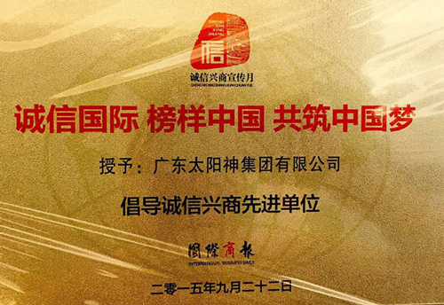 太阳神公司获“倡导诚信兴商先进单位”称号