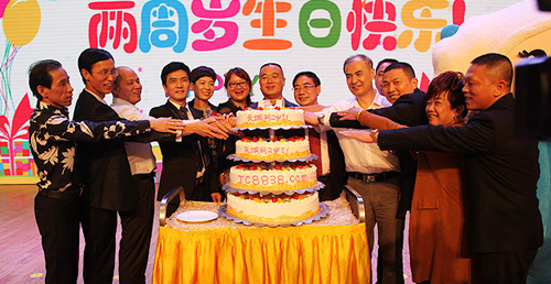 最后,伴随着欢快的生日祝福歌,天城网两周年定制蛋糕缓缓推上舞台中心。大会主持人文翰、邵亦冉邀请领导嘉宾、集团高管、云商精英和事业伙伴等走上舞台,分享节日蛋糕,许下美好心愿,共同庆贺天城网两周年快乐!