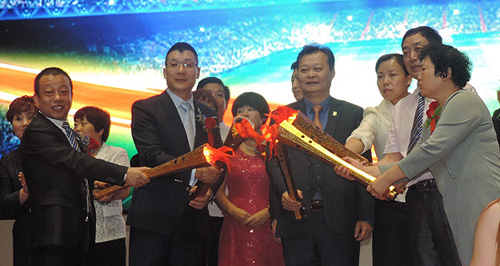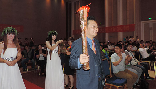 绿之韵集团执行总经理(全球营销中心)张力中先生手持火炬闪亮登场,将胡国安董事长从绿之韵发源地——湖南安化雪峰山明珠塔下取出的“绿之韵”火种传递到活动现场。这象征着企业创业精神星火相传、久久不息,象征着绿之韵人“筑梦、追梦、圆梦”创业征途,激发着绿之韵人奋发向上、生生不息创业之魂的绿之韵创业薪火,在隆钲系统领导人韩晓鸣的手中缓缓升起,熊熊燃烧,顿时全场响起了经久不息的掌声。河北绿之韵人必将以无限的创业激情,有序的创业计划去实现每个人心中的“中国梦、绿之韵梦”。