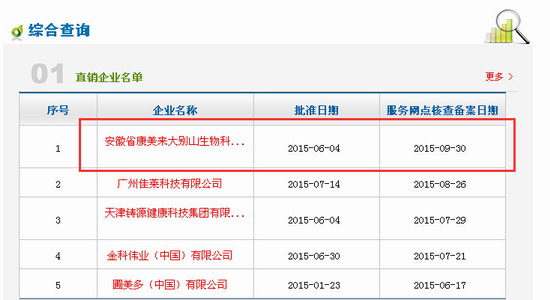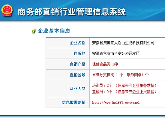 9月30日,商务部直销行业管理信息系统发布安徽省康美来大别山生物科技有限公司获得直销经营许可证。信息显示,康美来是于2015年6月4日获得批准,9月30日备案公示。获批省级直销分支机构安徽省,获批1款保健器材,备案2名直销培训员。