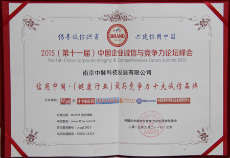 中脉荣获“健康行业最具竞争力十大诚信品牌”