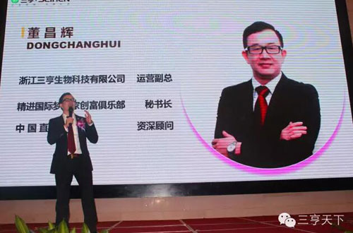 公司运营副总董昌辉先生激情演讲《三亨大未来·成就大梦想》,阐述了三亨的商业模式和价值远景。