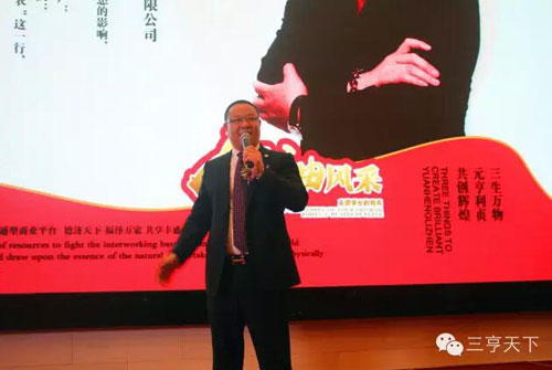浙江三亨生物科技有限公司董事长龚金夫先生上台发表重要讲话。他说三亨是德上的销售窗口,将利用其地域优势和先进的商业模式为事业伙伴们打造互通型商业平台,表示三亨、德上强强联手,对联合拿牌充满信心。