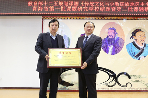湟中县教育局教研室主任李积雄,代表湟中县教育局和参与课题实践的22所学校的16000名师生,感谢新时代健康产业集团和黄总本人对课题实验研究的全面支持和热忱关怀。他说,三年来,新时代健康产业集团总计出资近70万元,共计为当地学校捐赠3.9万本国学书籍,为920名教师提供了培训资金,先后两次组织当地师生赴京参观交流并组织召开少数民族地区中华优秀传统文化普及传播研讨会,为课题研究创造了诸多便利条件。新时代健康产业集团的行动与努力有效改善了当地的教学面貌和师资水平,为优秀传统文化在少数民族地区的普及传播做出了积极贡献。