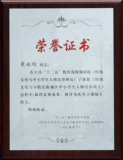 在当日下午举行的课题总结与授奖环节,郑增仪司长发表讲话,高度赞扬了新时代健康产业集团积极承担社会责任,大力弘扬中华优秀文化,鼎力支持少数民族地区教育事业发展的善行义举,并代表教育部“十二五”规划课题组,向公司和黄总个人分别颁发了“教育部‘十二五’规划课题研究优秀单位”和“优秀子课题主持人”的荣誉证书。