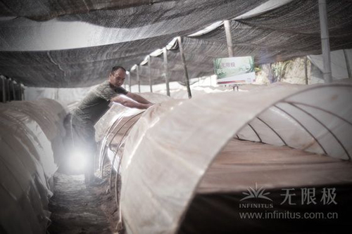 跟老项一样,药农老王也是一大早就在灵芝基地里忙活开了。他的第一件工作,就是把覆盖灵芝的塑料薄膜打开。正在弹射孢子粉的灵芝,需要合适的温度、湿度和空气等,塑料薄膜能够起到一定的调节作用。