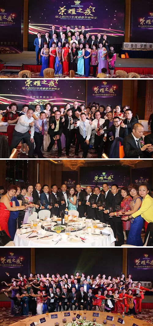 晚宴现场,胡国安董事长、董事常务副总裁劳嘉女士携公司高管以及集团全球战略委上台注酒,将“责任、梦想、荣耀”注入未来,共同祝愿绿之韵事业越来越好。