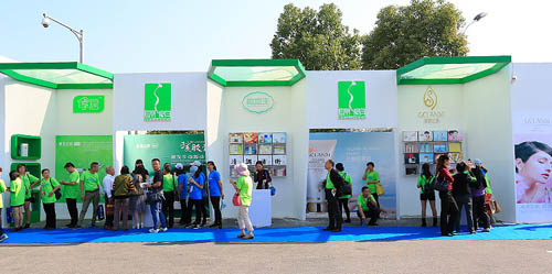 三大产品展区,首先印入眼帘的气势恢宏的企业文化立体展板,该展示区域从绿之韵产品、生产理念、研发团队、产品荣誉等多个方面直观、形象和生动地细数了绿之韵十二年产品文化传承、辉煌发展之路。以白色为底蕴,以绿色孕育生机,绿之韵旗下韵宜生、绿韵兰茜、享居三大系列产品展区柔美简洁,充分体现出自然、健康、优质的产品文化。嘉年华现场有专业的工作人员在展台前进行产品演示与互动,引得现场家人们竞相观看和体验。