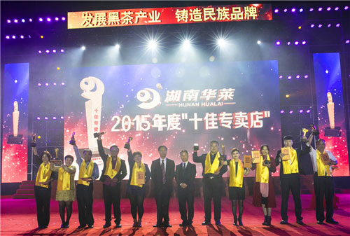 2011年7月,湖南华莱启动安化黑茶“千店万铺”代理加盟商户计划,短短6年间,“华莱健”黑茶席卷全国,成功开设省、市代理和专卖店1000余家,产品销往全国30多个省、市、自治区,市场抢滩俄罗斯、德国、韩国、日本等国家,年销售额数亿元。在这批“千店万铺”中,陕西省省级代理、河南省省级代理、山东省临沂市市级代理、重庆市市级代理、河北省石家庄市市级代理、河南省南阳市市级代理、天津市专卖店、广东省广州市专卖店、新疆乌鲁木齐市专卖店、江西省南昌市专卖店最终荣获“2015年度十佳专卖店”,他们以朝气蓬勃的姿态,登上了荣誉的殿堂,接受产业的表彰,享受成功的喜悦。