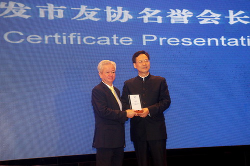 10月28日,由中山市政府主办,市外事侨务局、市港澳事务局、市人民对外友好协会承办的中山市国际友好合作交流会暨中山市人民对外友好协会理事大会顺利举行。国务院参事、外交部原副部长乔宗淮,中国人民外交学会党组书记、常务副会长卢树民,中山市委书记、市人大常委会主任薛晓峰,市委副书记、市长陈良贤,以及来自五大洲26个国家的近160位外宾和各界人士共300多人出席盛会。完美公司古润金董事长受聘为中山市人民对外友好协会名誉会长,许国伟副董事长受聘为名誉顾问,这是政府对完美公司为促进中外友好交流所作贡献的重要肯定。