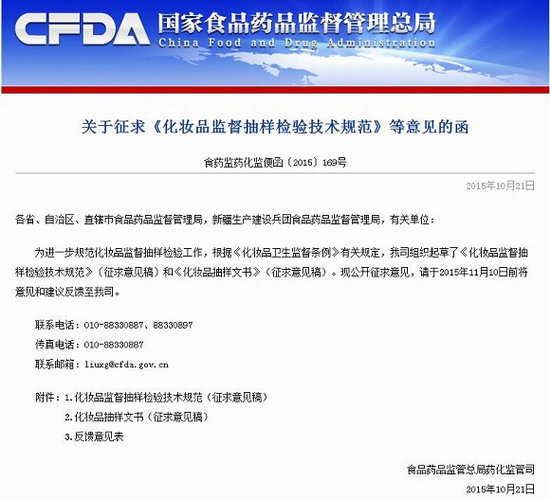 10月21日,食品药品监管总局药化监管司组织起草了《化妆品监督抽样检验技术规范》(征求意见稿)和《化妆品抽样文书》(征求意见稿),并开始公开征求意见,征求时间截止至2015年11月10日。