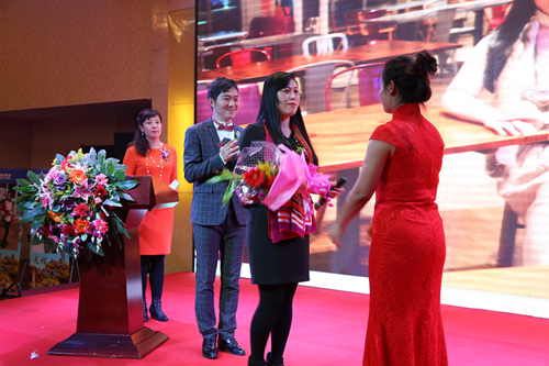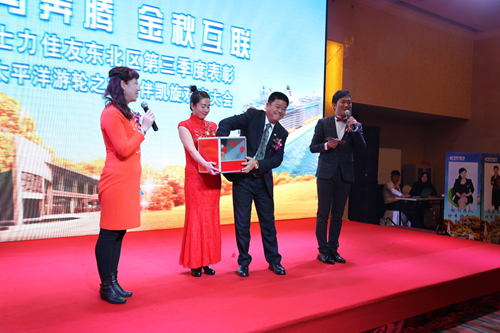 三季度新晋三星级健康顾问登台接受表彰,由王勇老师亲自为每一位家人戴上花环,送上鲜花,现场更是掌声不断,祝福每一位新晋的三星级健康顾问,公司更是准备了定制版旅行拉杆箱做为礼物,以资鼓励,两位三星顾问代表做了精彩分享。紧接着是新晋明星登台接受表彰,辉总再次登台为每一位家人戴上花环,送上鲜花并与各位合影留念,现场气氛达到高潮。高端的平板品牌电脑,是公司对每一位新晋明星的奖励,明星代表于红、常青、宁宁宁先后做了精彩的分享。