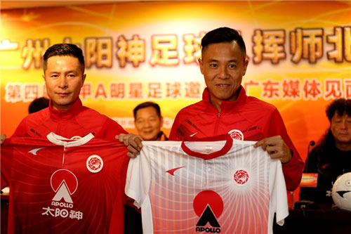 (彭伟国、胡志军展示广州太阳神队球衣)