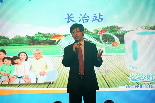 朱长军总监讲解金伟连净水机、宜悦空气净化机的主要卖点,现场用大量生动的例子针对双机产品的特点和销售中遇到的问题进行了详细的阐述,最后朱总监介绍了他在内蒙古多年积累的营销经验,使大家深受启发,现场响起热烈的掌声。