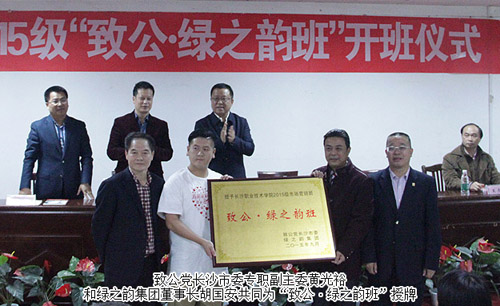 开班仪式上,长沙职业技术学院副院长王虎成致欢迎辞,党委书记彭惊雷宣布“致公•绿之韵班”开班,致公党长沙市委专职副主委黄光裕和绿之韵集团董事长胡国安共同为“致公•绿之韵班”授牌,现场爱心传递,真情涌动。