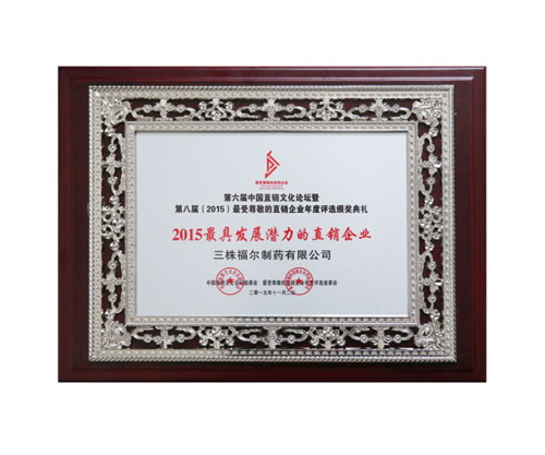 第八届(2015)最受尊敬的直销企业年度评选颁奖典礼也是2015年战略平台上行业英雄风云际会的舞台,鉴于历年来为中国直销业的发展所作出的卓越贡献和2014-2015年度的企业发展实际,为树立典范,表彰先进,经网上调查投票、各地企业经销商推荐和组委会专家评审委员会审核,三株福尔在此次盛会中被评为“2015最具发展潜力的直销企业”。