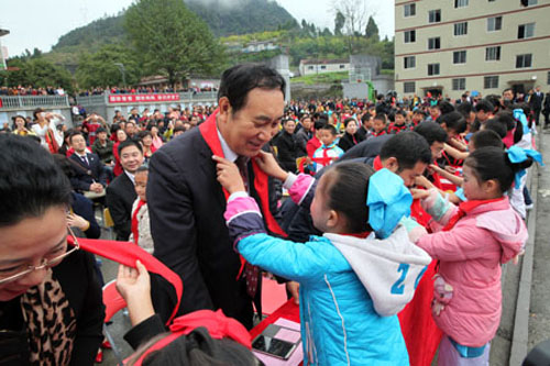 学生们为到场嘉宾佩戴红领巾