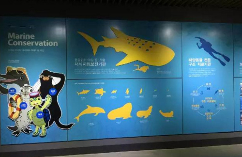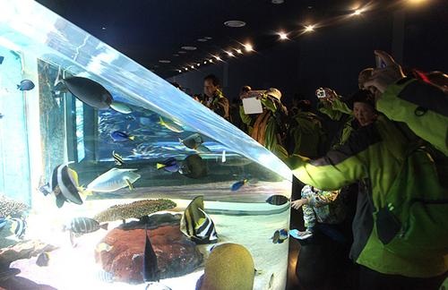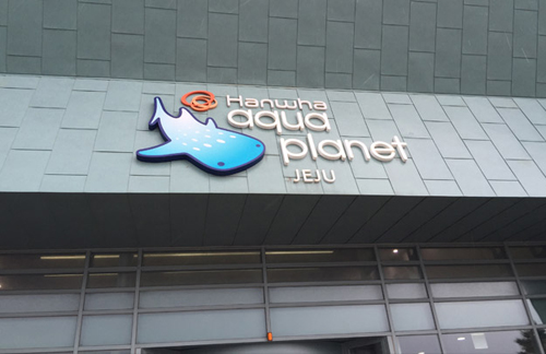 位于济州西归浦市城山邑古城里的韩华济州水族馆占地面积25600平方米,水池容积10800吨,是亚洲地区规模最大、并位居世界前十的水族馆。同时,作为韩国地区拥有鱼种最多(500多种)数量最大(48000条)的海洋主题馆,一直深受游客的青睐。包括鲸鲨、魔鬼鱼、海豚、大型鲨鱼及1万多条雀鲷等500余种,共4.8万多条生物深深吸引住了绿之韵的精英们。这里也曾经是韩国综艺节目《我们结婚了》的取景地之一。