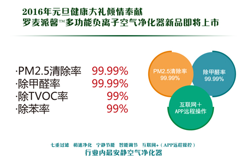 据世界卫生组织(WHO)报告显示,全球近一半的人处于室内空气污染中。在中国,近两年雾霾天气持续增多,很多城市PM2.5值频频爆表,空气质量时常处于中度或重度污染。虽然政府不断加大空气污染的治理力度,但短时间并不会得到明显改善。因此,为了呼吸到干净的空气,国内越来越多的人群开始选购空气净化器。但市场上各种功能,各种品牌的空气净化器产品众多,多数只有三层过滤,为粗过滤网、活性炭层及HEPA过滤胆这三种材制,这种净化器只对烟、尘、PM2.5等常规气系有效,对装修污染的效果甚微!而装置了七层过滤系统的罗麦派馨空气净化器,对甲醛的清除率可达到99.99%,它的面世,让您不再用身体当过滤器!