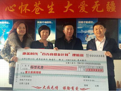 11月15日,康美时代山西分公司张志强经理及人保下属销售公司张秀艳总监登门拜访刘晓峰,张志强经理代表康美时代向刘晓峰送上鲜花及精气神大礼包一盒,保险公司张秀艳总监向刘晓峰送上10万理赔金支票。