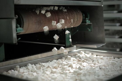 经过手工两次去皮后,工人会将我们经过机器裁切,变成我们平时见到的白色块状茯苓。