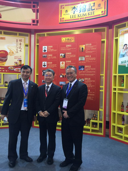 李惠中先生(右)邀请光明(中)和中粮(左)负责人参观李锦记展位
