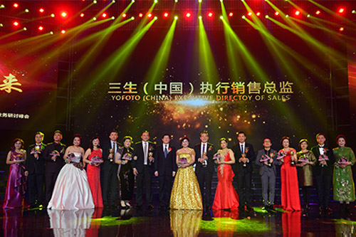 三生(中国)运营中心副总裁罗修彪先生、三生国际运营中心总裁吴志民先生为销售总监颁发鲜花与奖杯
