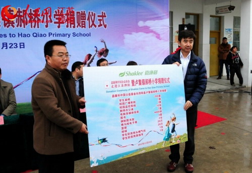 不期而至的一场冬雨使得苏北大地寒意逼人。23日下午,江苏泗阳县卢集镇郝桥小学的校园里迎来了一群客人,让学校的孩子们感到暖意融融。这是嘉康利中国公益基金首次走进江苏,在江苏省工商行政管理局的协助下,为郝桥小学捐赠了价值近25万元的现代化教学物资。