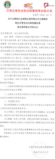 今天上午,足协官网发布《关于天津松江足球俱乐部有限公司主要股权转让并更名为天津权健足球俱乐部有限公司的公示》,公示指出,由于天津松江足球俱乐部内部原因和自身发展需要,中国足协职业联赛理事会按相关规定,经审核,受理天津松江足球俱乐部有限公司主要股权转让并更名的事宜。