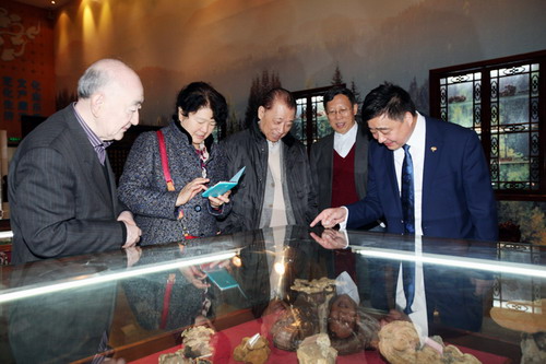 12月1日,国家商务部原副部长周可仁(图左三)、国家民政部原副部长陈虹(图左一)一行来到安惠公司,在安惠公司董事长陈惠的陪同下参观了中华灵芝文化馆、提取车间、蕈菌园、四圣园等。