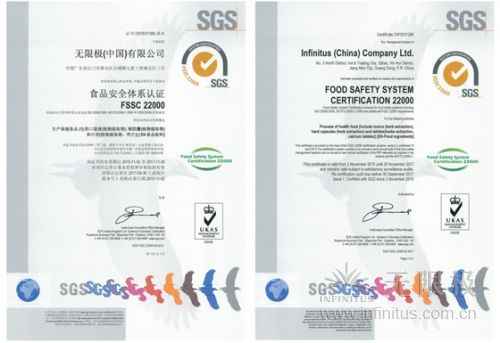 近日,无限极通过第三方认证服务机构SGS认证审核,获得英国皇家认可委员会(UKAS)正式颁发的食品安全管理体系FSSC22000:2013证书,证书有效期至2017年11月30日。通过本次认证,表明公司获“全球食品安全倡议”(GFSI)框架下650个成员的认可,增强了公司产品的全球性信誉,有助于公司开拓国际市场。