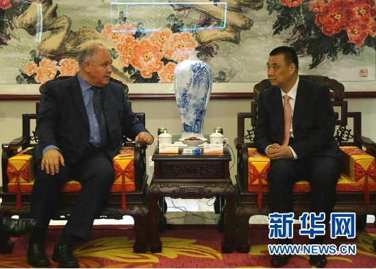 康美药业董事长、总经理马兴田(右)与加拿大万锦市长薛家平(左)会谈