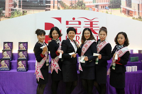 完美公司展位时尚宽敞、精美大方。来自中山地区的部分经销商代表担任本次展会的工作人员,岳新鸿副总经理现场指导参展工作,要求完美工作人员要热情接待参展商、顾客,为他们提供细致、周到的完美服务,让更多人认识完美、了解完美,用上完美的优质产品。同时,岳总还与工作人员共同玩起“玛丽艳就是有气质”的微信互动游戏,现场拿起玛丽艳维E润手霜合影,鼓励大家通过游戏互动,传递公益爱心,帮助更多有需要的人。