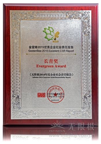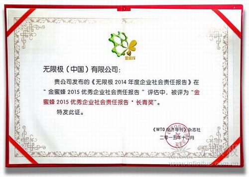 12月3日,由《WTO经济导刊》与中国可持续发展工商理事会主办的第八届中国企业社会责任报告国际研讨会在北京举行。会上,无限极获颁“金蜜蜂2015优秀企业社会责任报告·长青奖”。这是自2013年以来,无限极第三次获得该奖项的认可。同时获得该奖项的知名企业有:华为、中国移动、英特尔中国等。
