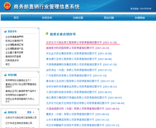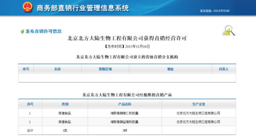 2015年12月17日,北京北方大陆生物工程有限公司获得由中华人民共和国商务部颁发的“中华人民共和国直销经营许可证”。