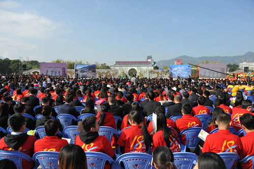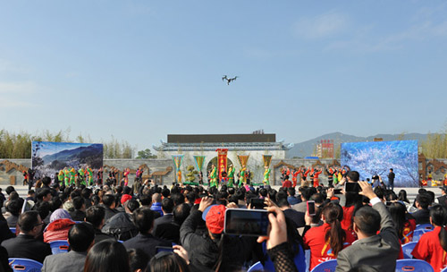 在莲花山公园落成移交仪式礼成后,黄耿城书记、陈群峰市长与马兴田、许冬瑾伉俪共同拉起“首届普宁梅花旅游文化节”启动杆,宣布文化节正式开幕。