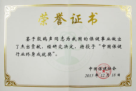 为表彰为我国保健行业的发展做出杰出贡献的先进个人,中国保健协会授予张凤楼、潘学田、殷鹤声、陈玉松、王尤山五位同志“中国保健行业终身成就奖”。殷总正在深圳参加市场年会,由董总代殷总接受了中国保健协会第二届理事长张凤楼和第三届理事长秦小明的共同颁奖。