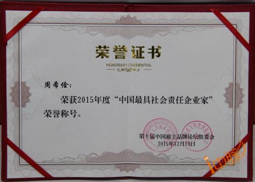 2015年12月19日,第十届中国雇主品牌论坛在北京隆重举办,中脉科技获颁“2015年度中国最佳雇主”殊荣,中脉健康产业集团董事局主席周希俭荣膺了“2015年度中国最具社会责任企业家”荣誉称号。