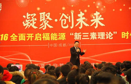 2015年12月19日晚上,福能源生物科技有限公司在成都加州花园酒店召开“新三素理论”时代说明会。公司领导、福润系统优秀领导人及经销商伙伴约500人出席会议!