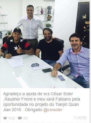 法比亚诺写到:“感谢索莱尔、弗莱雷、科斯塔帮助我得到在2016年加盟天津权健的机会。”据巴西媒体之前的报道,法比亚诺在权健将拿到660万巴西雷亚尔的年薪,约合人民币1084万元。