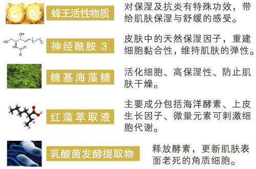蜂王精华富含的蜂王乳精粹来自法国优良的自然生态油菜花田,具有高营养、高活性的特点。蜂王乳是大自然的液体黄金,是最天然的美容剂。蜂王乳除了富含丰富的营养素、天然雌激素、多酚类和B族维生素外,更含有人体必需的氨基酸、微量元素和不可或缺的矿物质。采用创新的微脂囊包覆技术,将蜂王乳贮藏于独特薄膜中,保存了蜂王乳的活性,提升了蜂王乳的修复能力。其磷脂质外膜接近肌肤细胞膜结构,具有极佳的肌肤相溶性,帮助吸收。