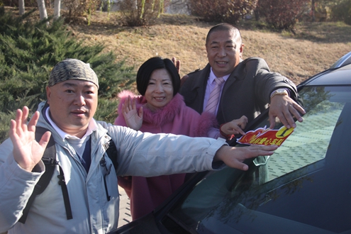 10月28日清晨-3摄氏度,寰宇大使董丽萍副总,陈以勳副理事长共同为爱心车队贴上车贴